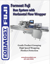 The Formost Fuji Bun Wrapper System offers a redesigned grouper which allows for higher speeds while gently grouping product for package count. With a complete inline flow design, the Bun System eliminates problems with 90 degree transfers and provides for a more efficient and simple floor plan. Combined with a horizontal flow wrapper to ensure product protection, the package optimizes shelf life and freshness.